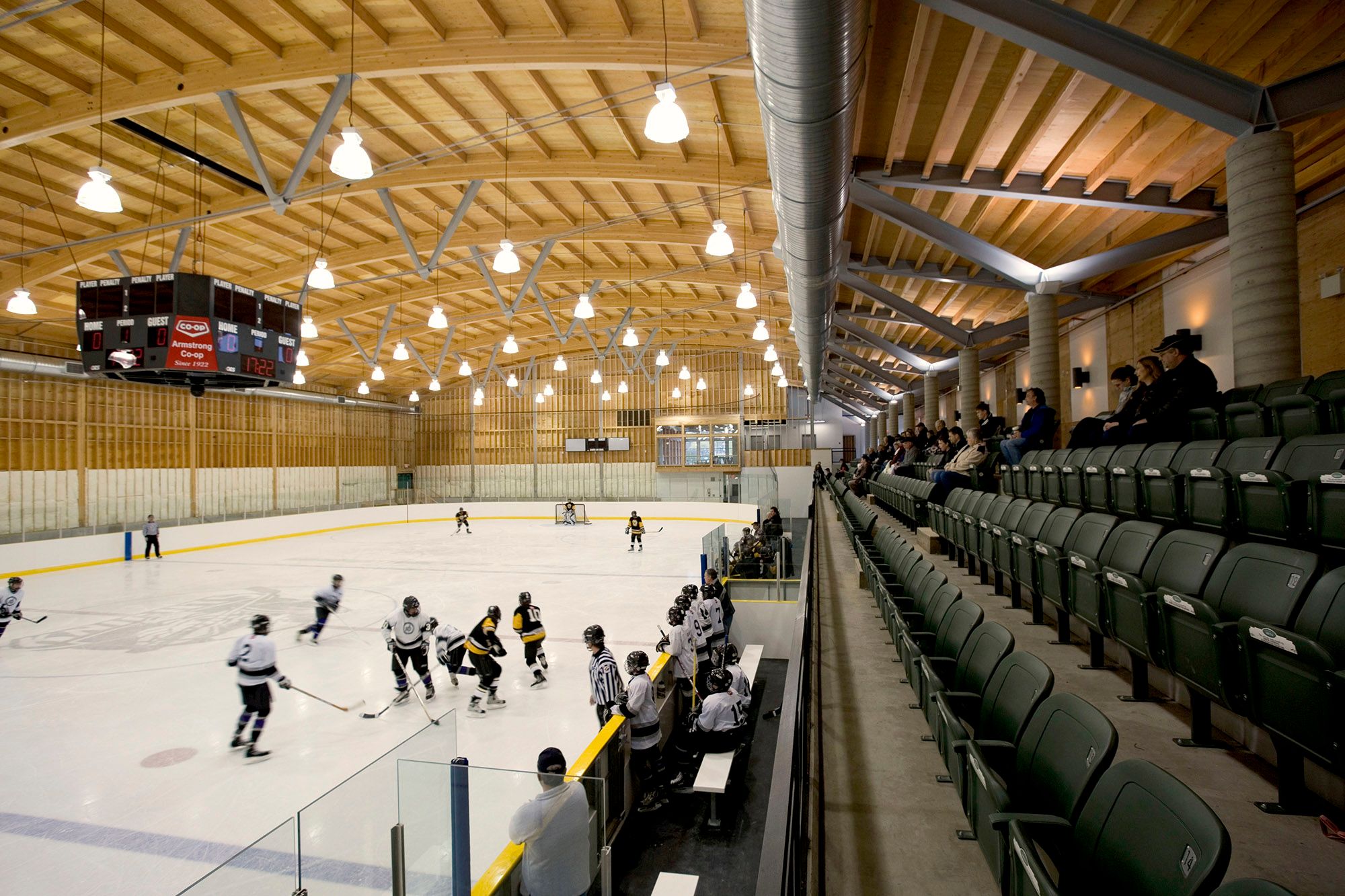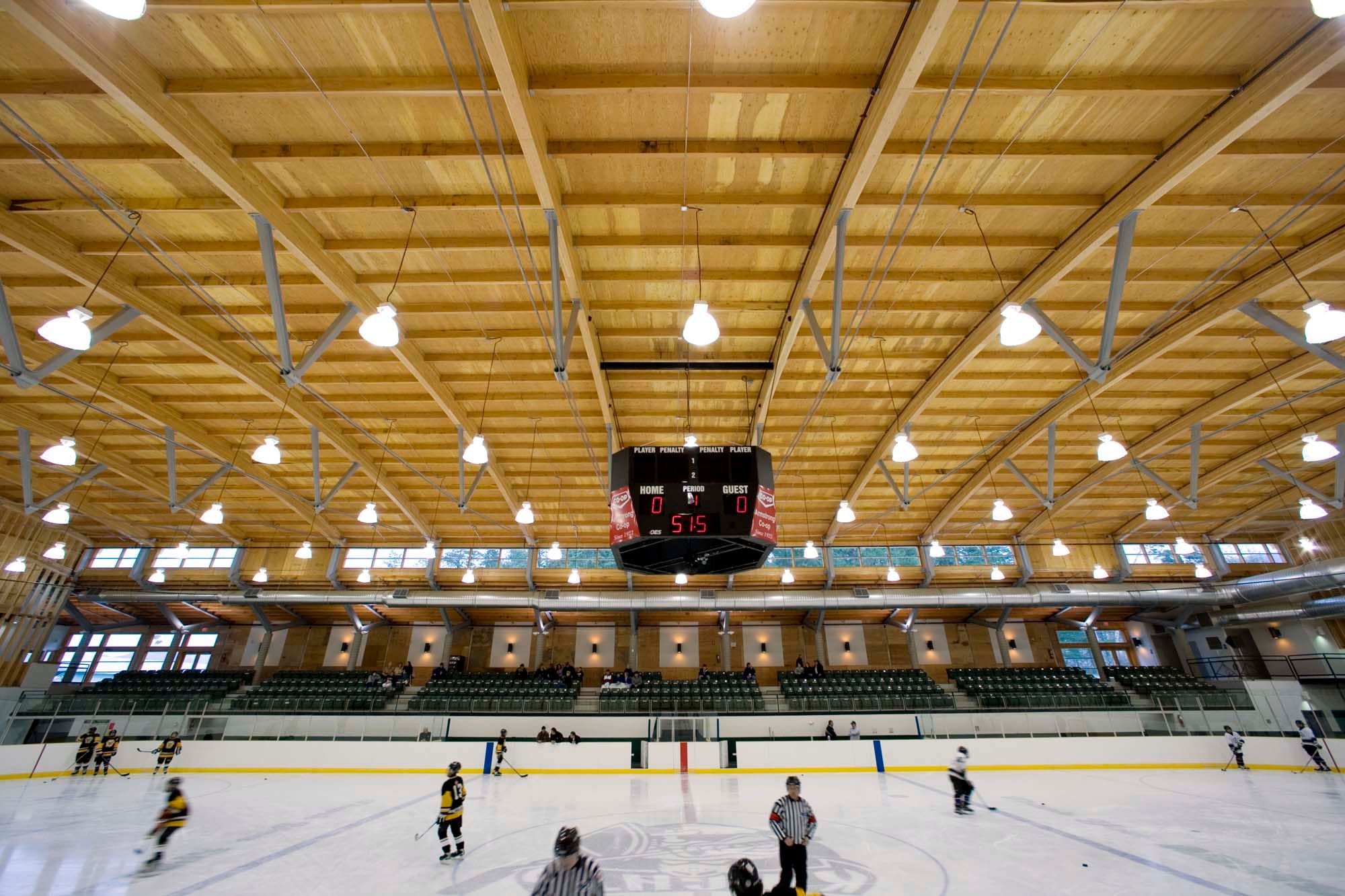 Wood design became the anchor. The arena’s mass-timber structure celebrates the strength and craft of the local forestry sector, with many companies donating material and equipment to bring the building to life. The design also responds thoughtfully to the site: the arena is nestled into a wooded hillside, creating separate, at-grade entrances for participants and spectators. Inside, full-length clerestory windows wash the space with soft, indirect daylight and frame views of towering evergreens—a reminder of the land that shaped the facility.