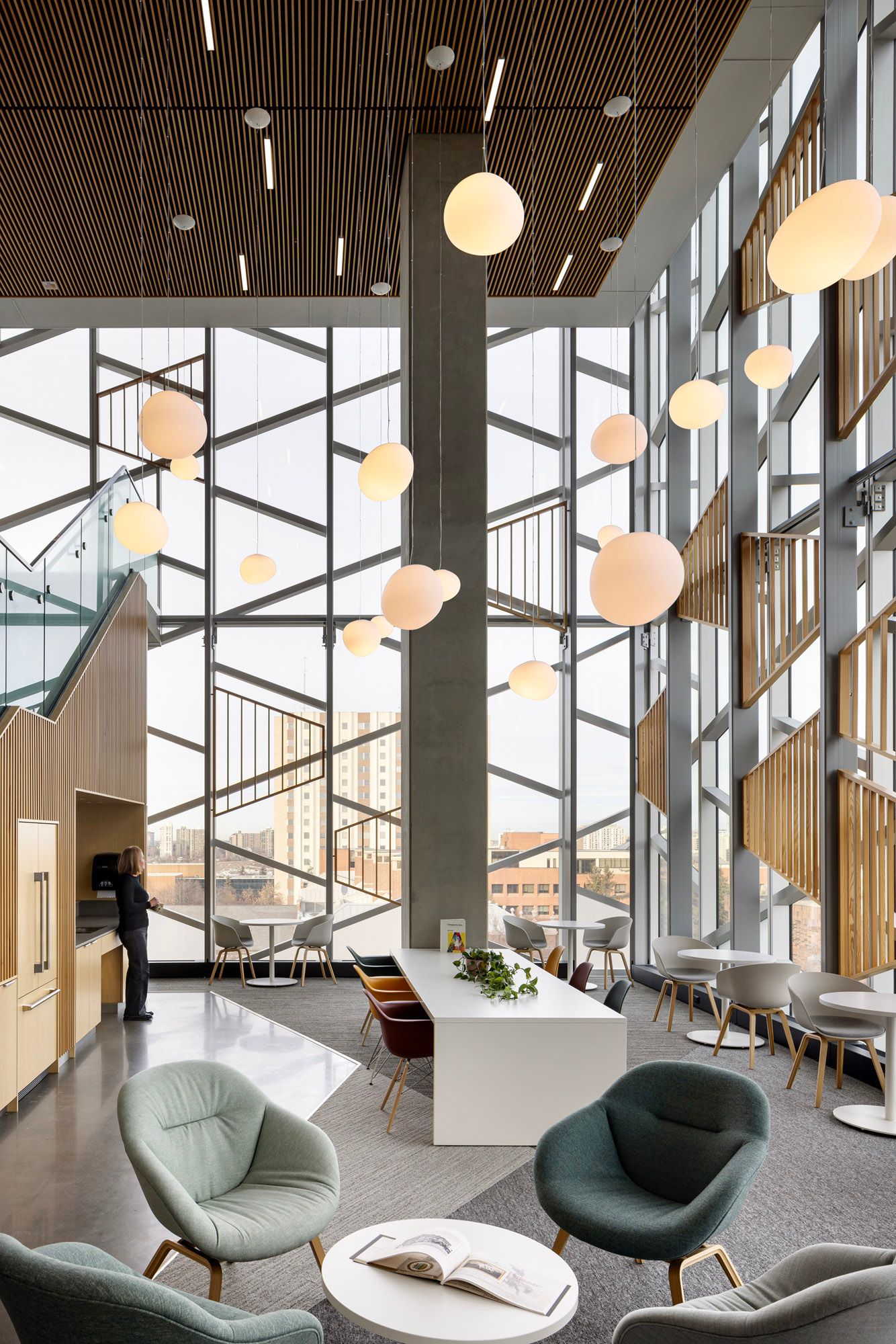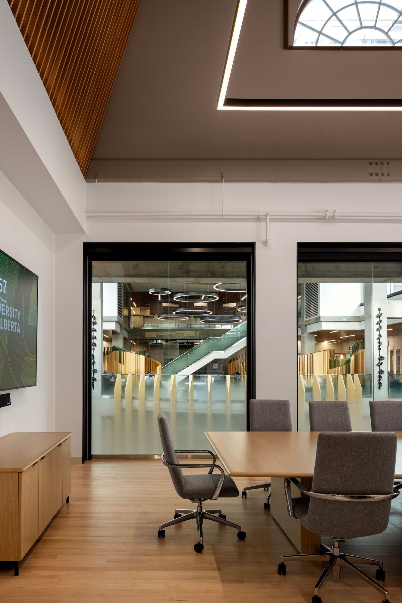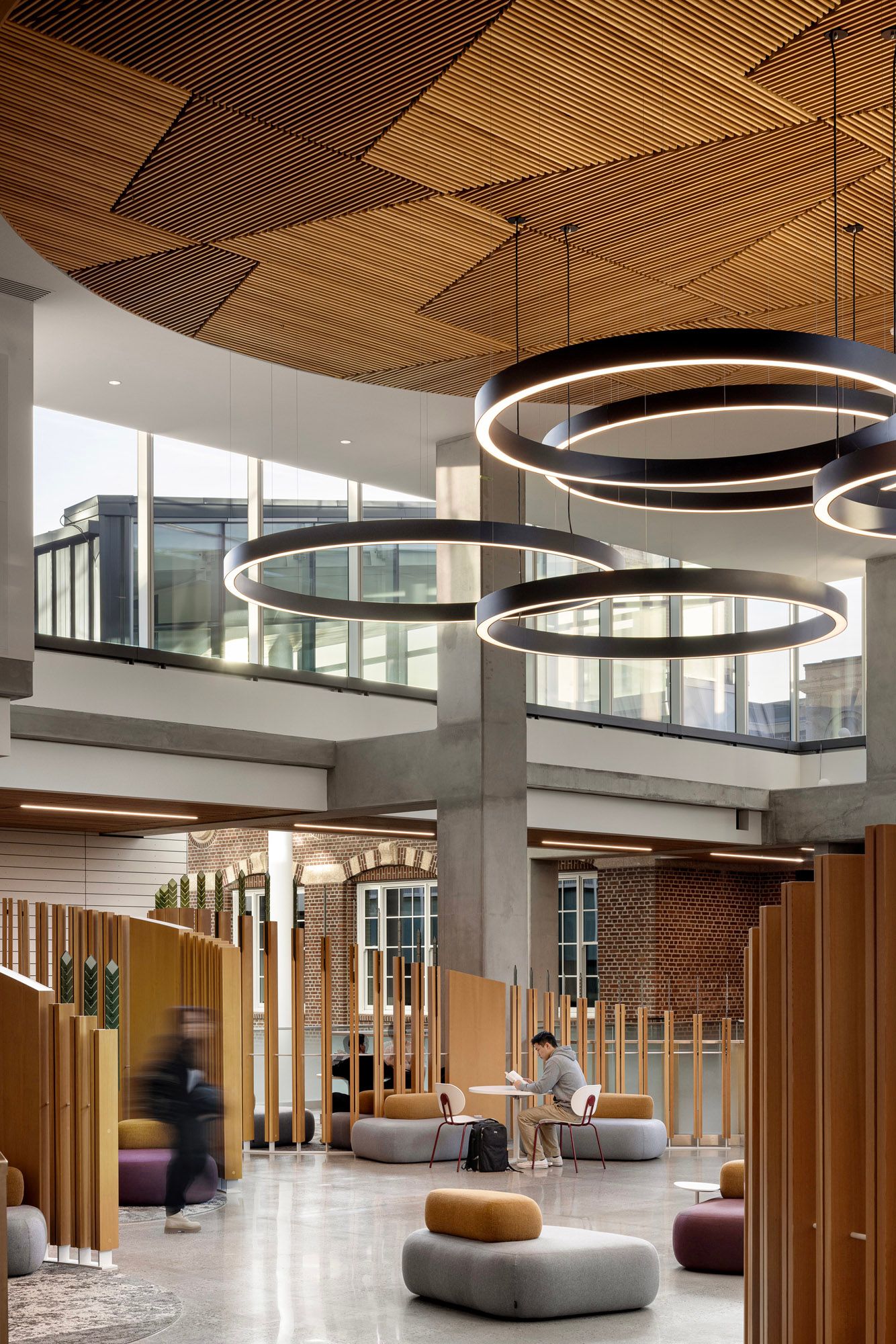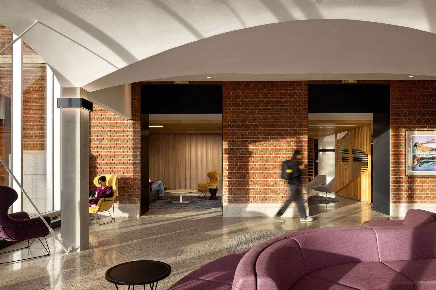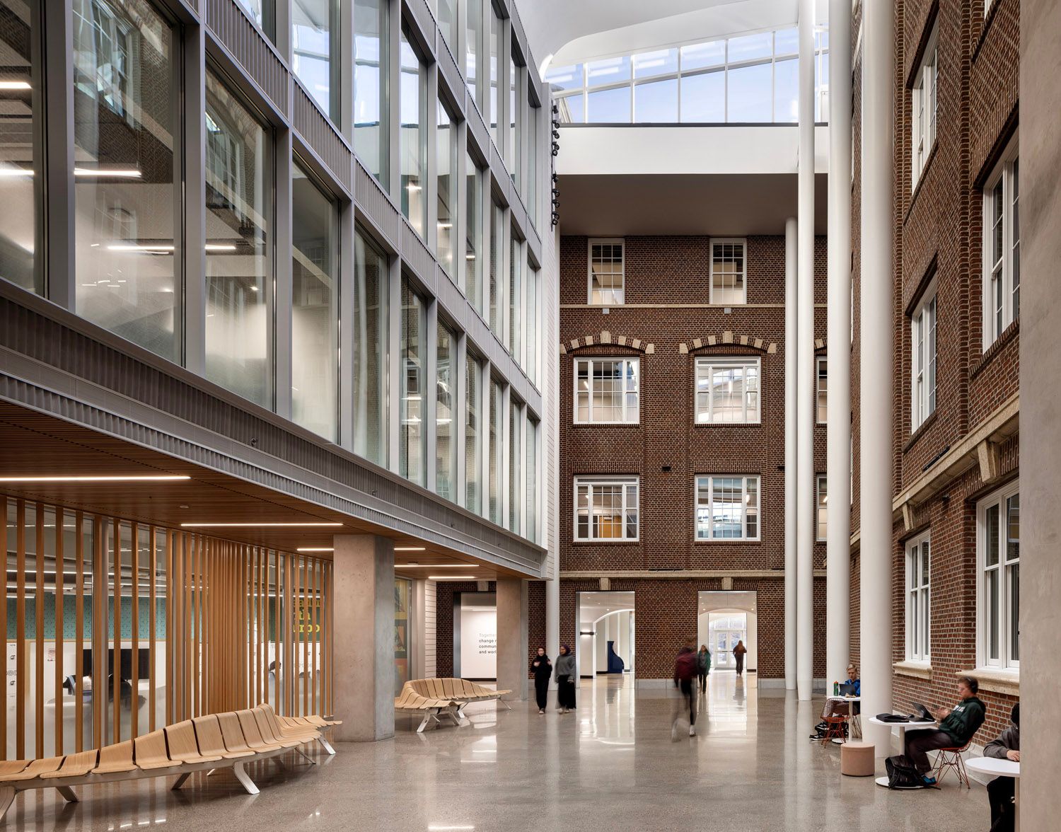 To the north, a new seven-storey addition rises in contrast and complement. Its glass walls reflect the surrounding campus and invite in natural light, while inside, open-plan “neighbourhoods” encourage movement and conversation. These double-height zones are connected by staircases that make it easy to skip the elevator and cross paths with colleagues or classmates on the way.