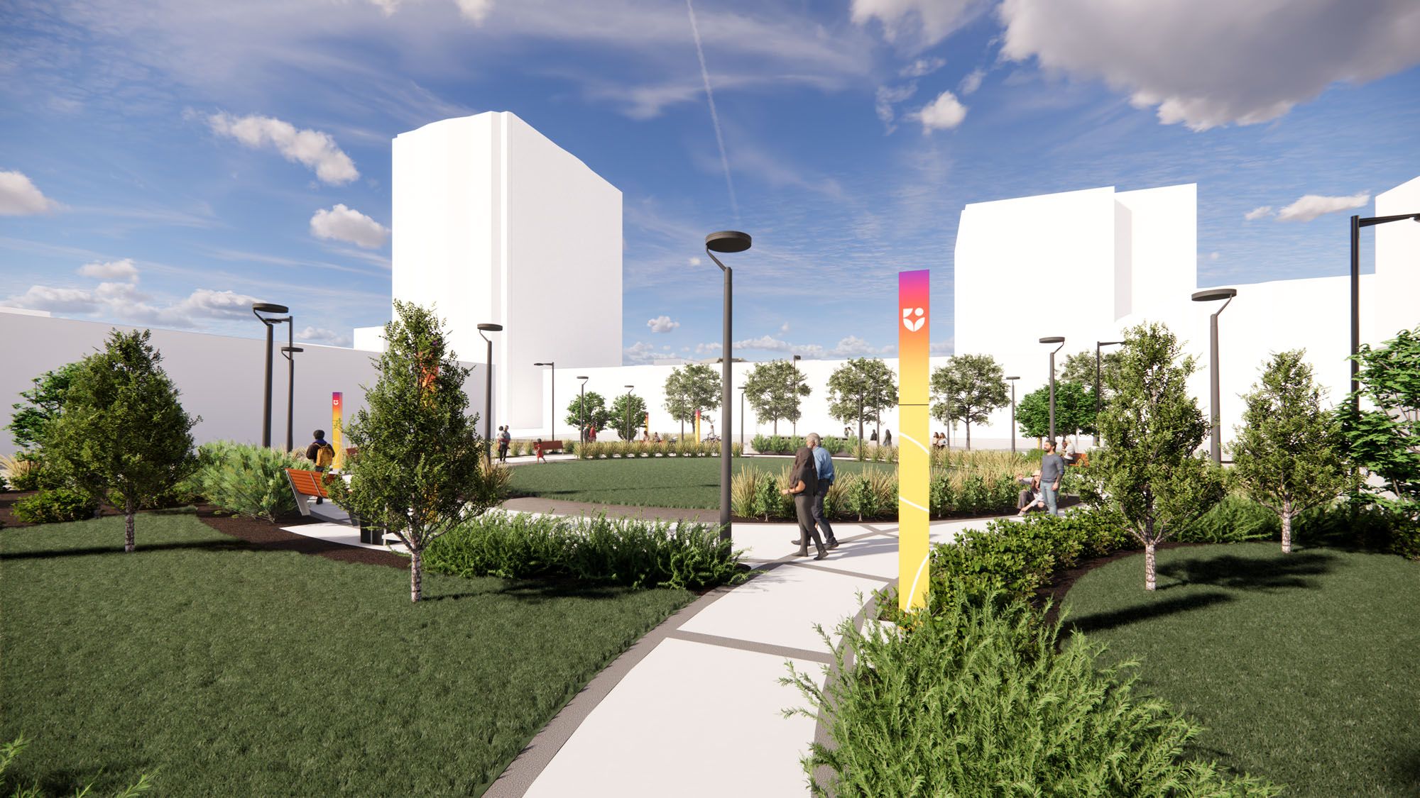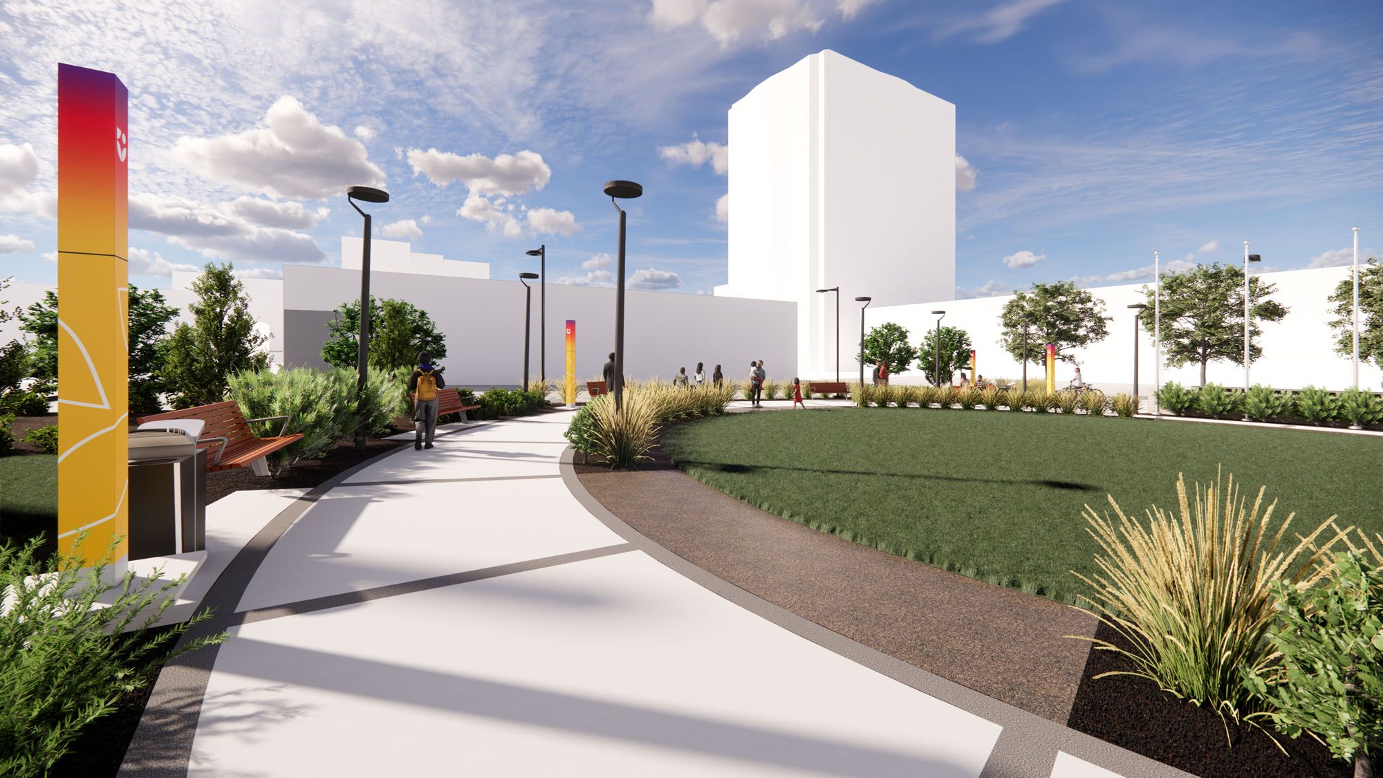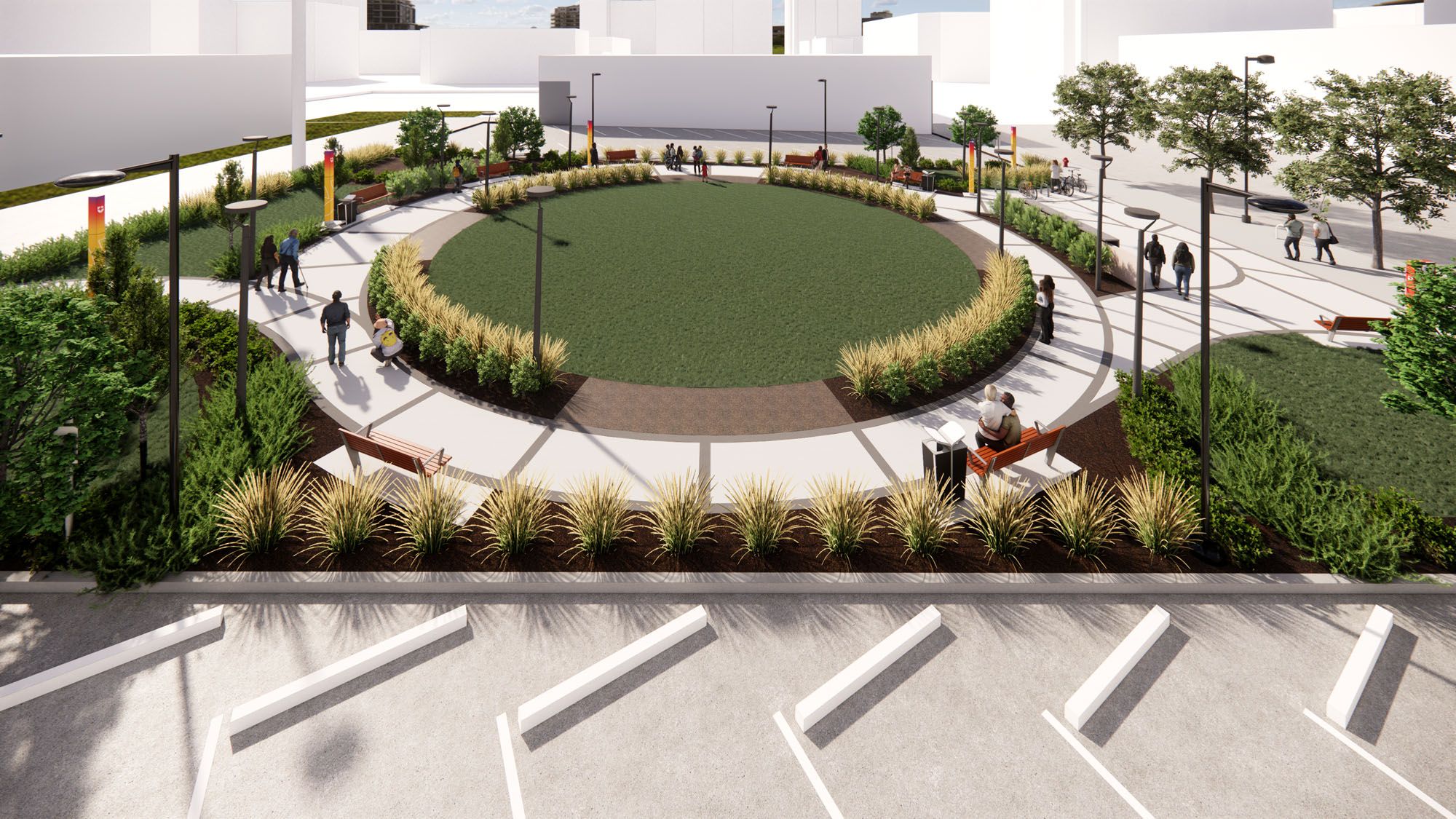 The park balances cultural storytelling with everyday functionality. Benches, bike racks, lighting, and clear signage guide movement and support community use. Sustainable features, including permeable surfaces, native plantings, and energy-efficient lighting, promote biodiversity and responsible water management. Adjacent parking remains accessible but is thoughtfully screened through landscaping that preserves sightlines and safety.