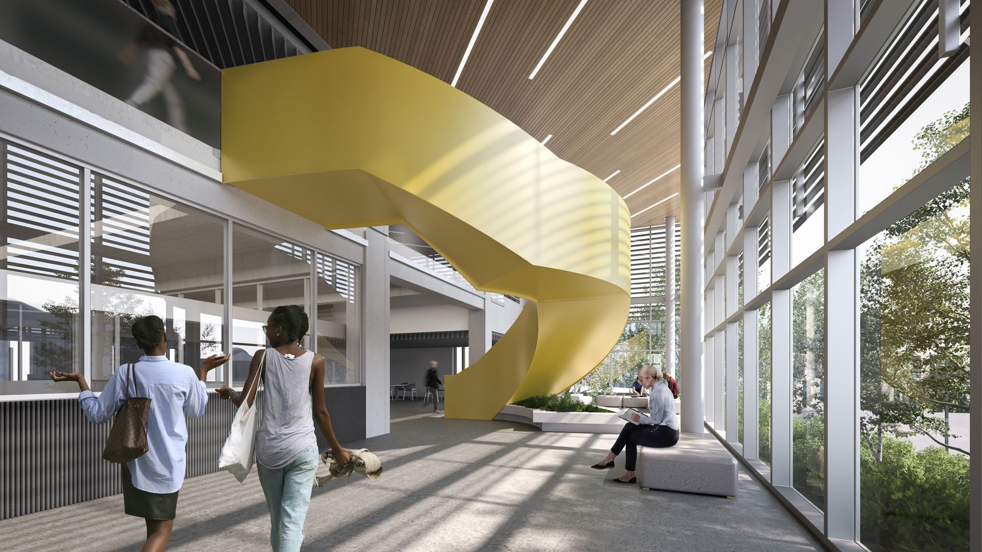 Inside and out, the building has a clearer identity. A yellow steel stair and glazed façade serve as intuitive visual markers, helping people orient themselves across the engineering complex. Accessible, terraced pathways exceed barrier-free requirements and allow everyone to move through the site with ease. South-facing terraces introduce new outdoor amenities that support informal study, conversation, and quiet breaks throughout the seasons.